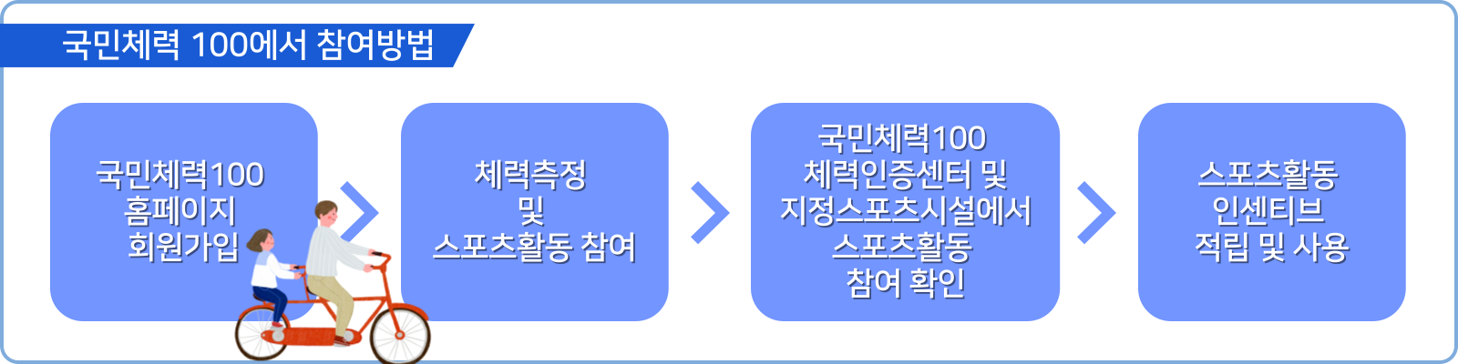 - 국민체력 100 체력인증센터 및 지정스포츠시설에서 스포츠활동 참여를 했는지 확인을 합니다.