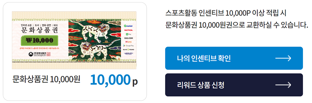 - 리워드상품 신청 기간 : 2023.04.24~2023.12.31(스포츠상품권이나 문화상품권으로 신청해서 받으실 수 있습니다.)