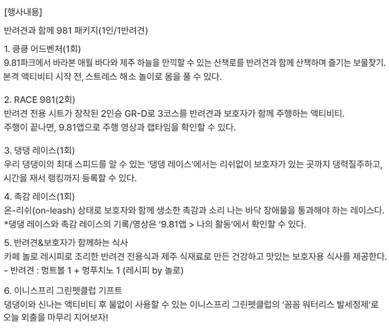 - 요금 : 반려견과 함께 981 패키지 (1인/반려견) - 99,500원