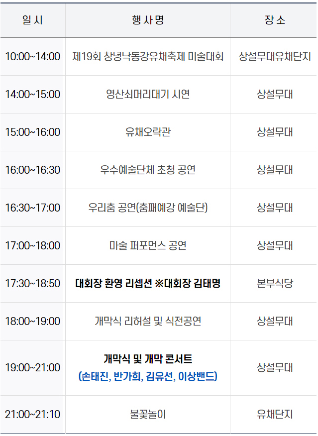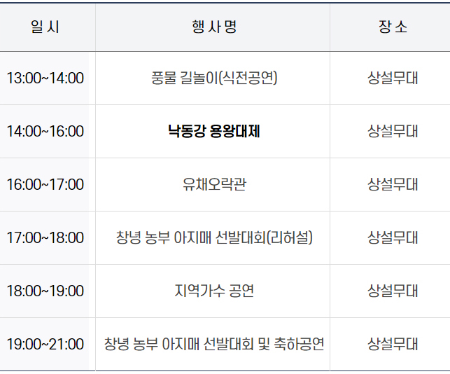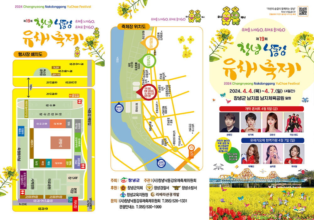 창녕군 남지읍 낙동강 유채단지는 전국에서 단일면적으로 최대 규모인 110ha(33만여 평)로, 낙동강의 절경과 어우러진 한 폭의 풍경화입니다. 나비와 벌이 꽃처럼 가득한 낙동강유채단지의 아름다움을 전국에 알리고 관광객과 지역민이 함께 어울려 줄기는 축제이며, 2006년 1회를 시작으로 역사와 생태의 고장 창녕군의 대표자리로 자리매김하고 있습니다.