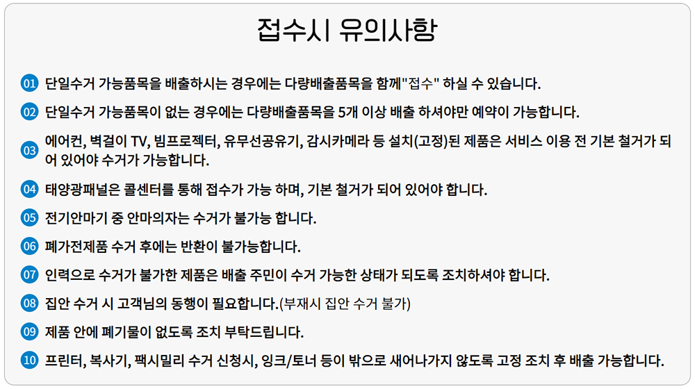 | 가전제품 | · 원형 훼손 제품 (냉장고 냉각기, 세탁기 모터 훼손, 온전한 형태가 아닌 분해 되어 있는 제품 등) · 맞춤 제작된 대형 제품 (빌트인, 냉장, 냉동창고 등) · 전기안마기 중 안마의자 · 선택 품목 (소형 가전제품) 5개 미만 요청 시 |