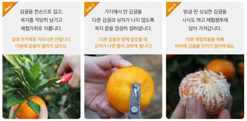 - 체험내용 : 감귤 따는 방법 및 안전 수칙교육, 감귤 따기 체험 및 시식, 기념사진활영