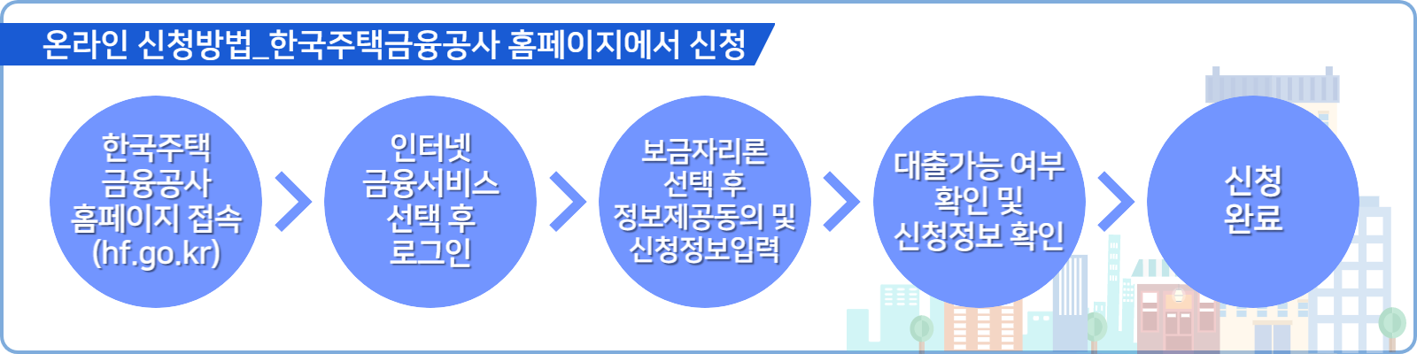 - 한국주택금융공사 홈페이지에서 온라인 신청이 가능합니다. (전화문의 : 1688-8114)