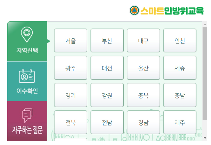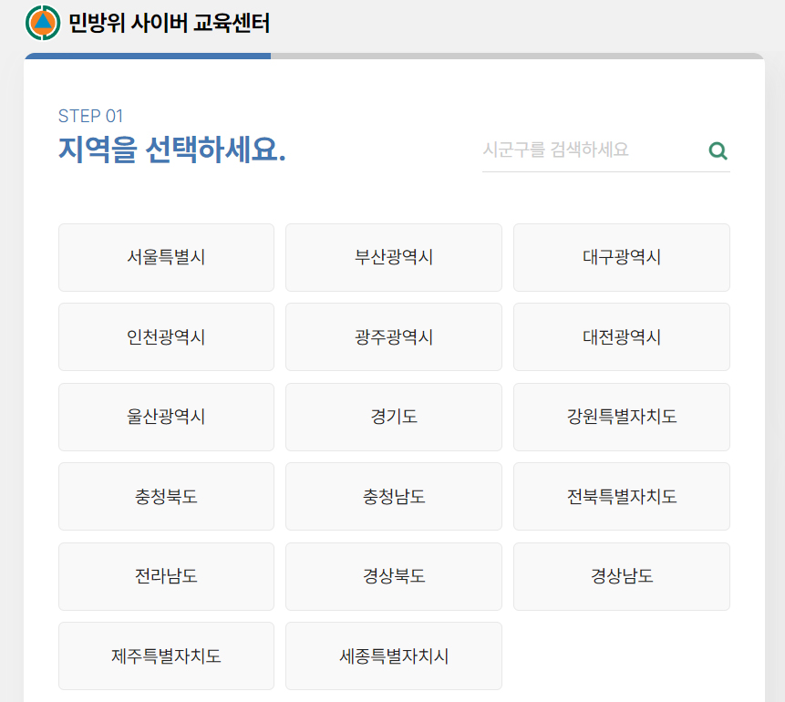 - 지역선택에 해당지역이 없을 경우에는 관할 시·군·구청 또는 읍·면·동 행정복지센터 민방위 담당자에게 문의하여 담당 교육센터를 확인하시기 바랍니다.