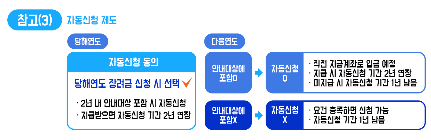 ⑤자동 신청 제도 : 60세 이상 고령자 및 중증 장애인이 장려금 신청 기간에 동의하면, 향후 2년 내 신청 안내 대상 포함 시 자동으로 신청